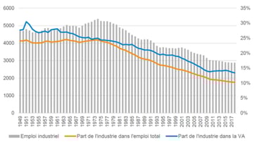 Le constat est sans équivoque : Depuis 1974, le secteur industriel s’est délesté de plus de la moitié de ses postes (passés de 5,4 à 2.2 millions) pour ne représenter aujourd’hui plus que 10.3 % du vivier total d’emplois en France, tandis que la part de l’industrie dans le PIB s’est amaigrie de 10 points (7). Ce délitement s’est fait comme on le voit de manière uniforme et constante dans le temps.