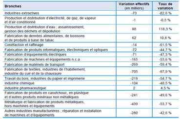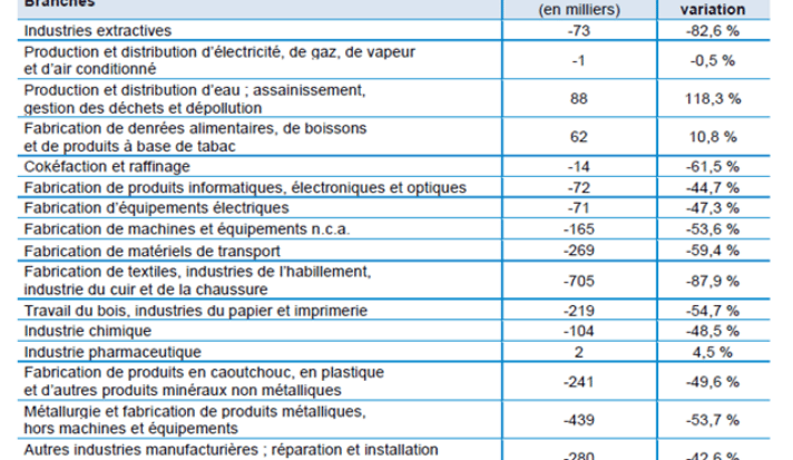 Nous pouvons décemment emprunter un peu au sensationnalisme en affirmant que la transformation économique dont il est question ici pourrait s’apparenter à une anti révolution industrielle. Il s’agit de fait d’une des réalités que présente le nouveau paradigme économique français post-74. Si les précédentes révolutions industrielles ont livré des courbes d’activités économiques explosives suite à de vifs progrès énergétiques (la machine à vapeur puis l’énergie électrique et pétrolière), le premier choc pétrolier a, lui, fait l’effet d’une implosion. La composition du vivier national d’emplois industriels s’est ainsi globalement désagrégée, et rares ont été les branches épargnées (3) :